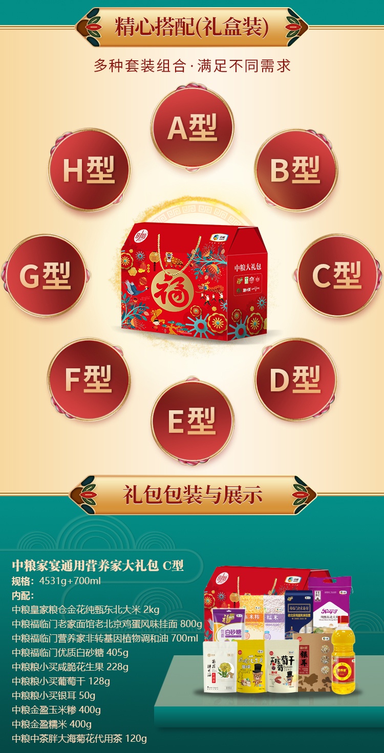 净含量:4531g+700ml 内配: 中粮皇家粮仓金花纯甄东北大米 2kg 中粮福临门老家面馆老北京鸡蛋风味挂面 800g 中粮福临门营养家非转基因植物调和油 700ml 中粮福临门优质白砂糖 405g 中粮粮小买咸脆花生果 228g 中粮粮小买葡萄干 128g 中粮粮小买银耳 50g 中粮金盈玉米糁 400g 中粮金盈糯米 400g 中粮中茶胖大海菊花代用茶 120g
