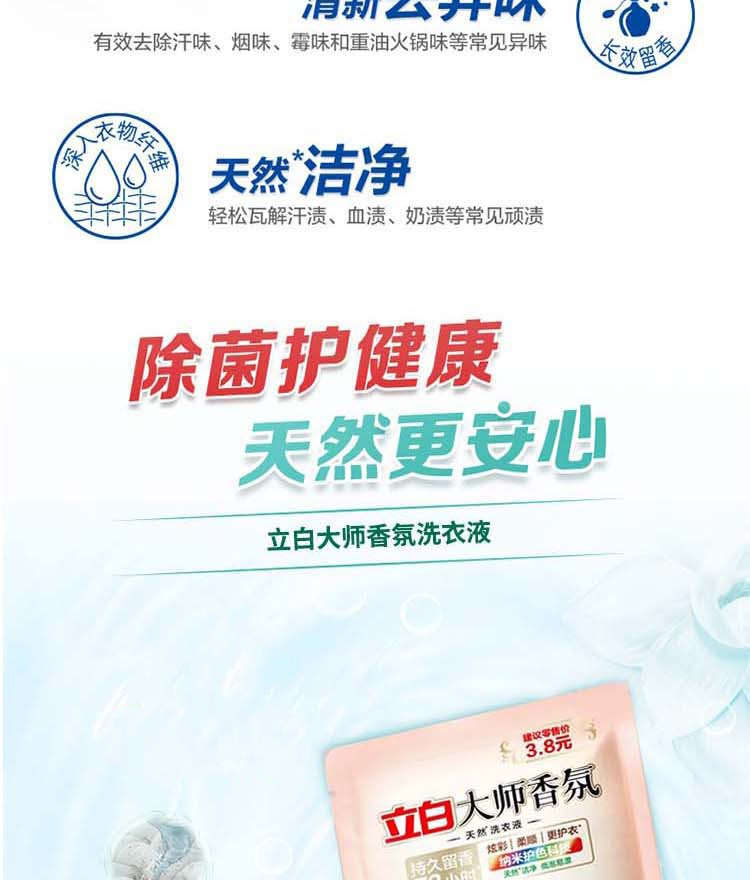 产品配置:立白除菌去渍洗衣液1.05kg/立白酵素洗洁精455g/立白大师香氛洗衣液100g 玫瑰花香*2/立白御品海洋精华手洗内衣特护洗衣液80克*2