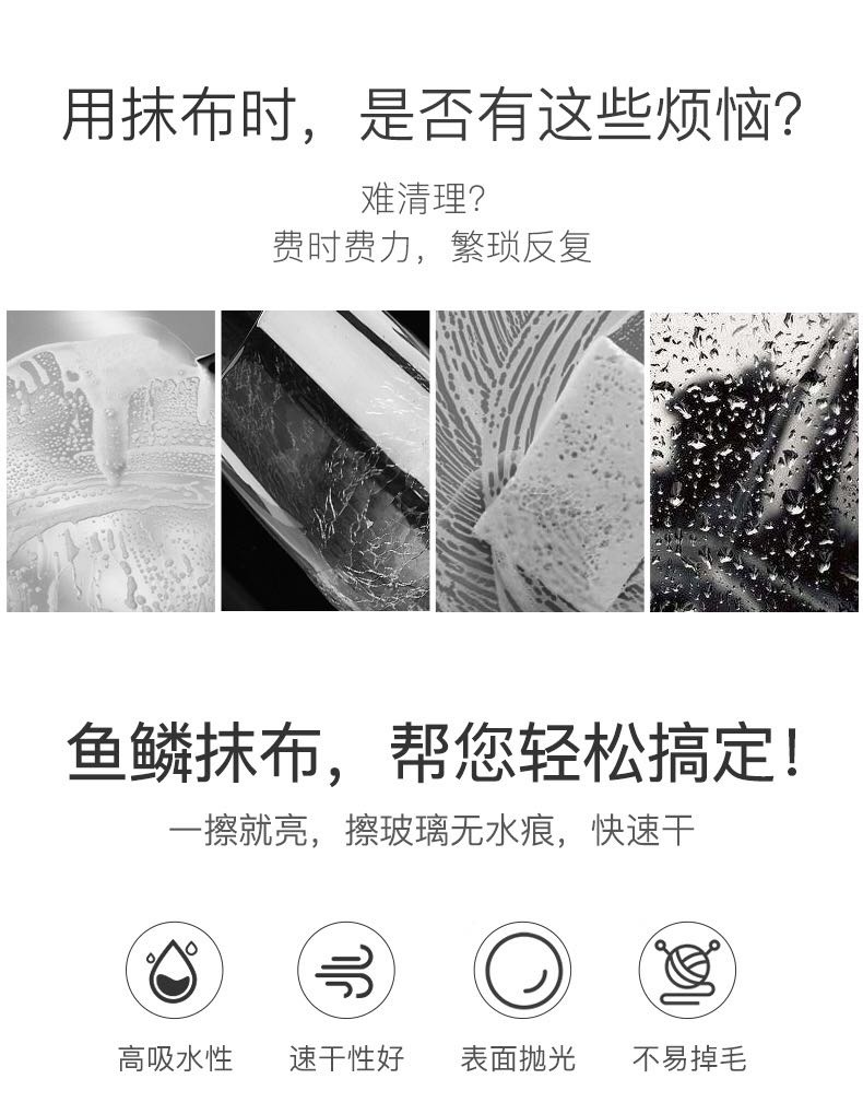 品名:鱼鳞抹布 规格:25*25 包装:常规10片装 这是一款可以擦拭玻璃的、镜面的家务清洁抹布。超细纤维材质,鱼鳞格设计,增加摩擦力,去污力强。吸水性强、无水痕、不掉毛。还在忍受玻璃亮面家具,汽车后视镜模糊不清,灰凸凸一片吗?这款炒鸡好用的高颜值鱼鳞玻璃布解诀了你所有烦恼!