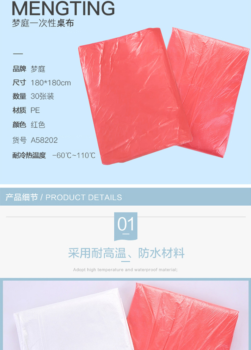 商品属性 [产品名称] 梦庭MENGTING 一次性桌布30张PE加厚材质饭店餐桌婚宴酒席台布A58202(30张一次性桌布,180cmx180cm) [ 品牌] 梦庭 [型号] A58202 [耗材] 快递袋
