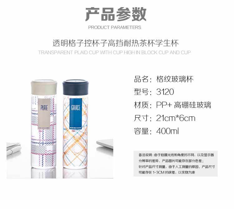 商品属性 [产品名称] 创意简约格子玻璃杯女学生便携随手杯子耐热玻璃茶杯 [品牌] 其他 [容量] 400ML